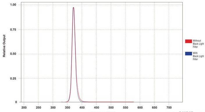 名義紫外照射 OPTI-LUX™ 365典型波長輸出圖,紅色為不配黑色濾色片的波長輸出,藍色為配黑色濾色片的濾長輸出,峰值都是365nm。 配及不配內(nèi)置黑色濾色片時波長輸出 當 OPTI-LUX™ 365的波長進入可見光范圍時,在400nm波長時,配有黑色濾色片可顯著降低強度達50%。